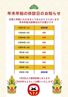 誠に勝手ながら、当院は年末年始のお休みを12/28(日)〜1/4(日)いただきます。ご迷惑をお掛けしますが、ご理解の程宜しくお願いします。